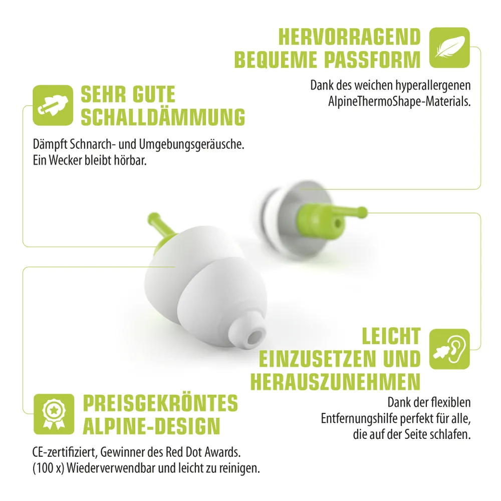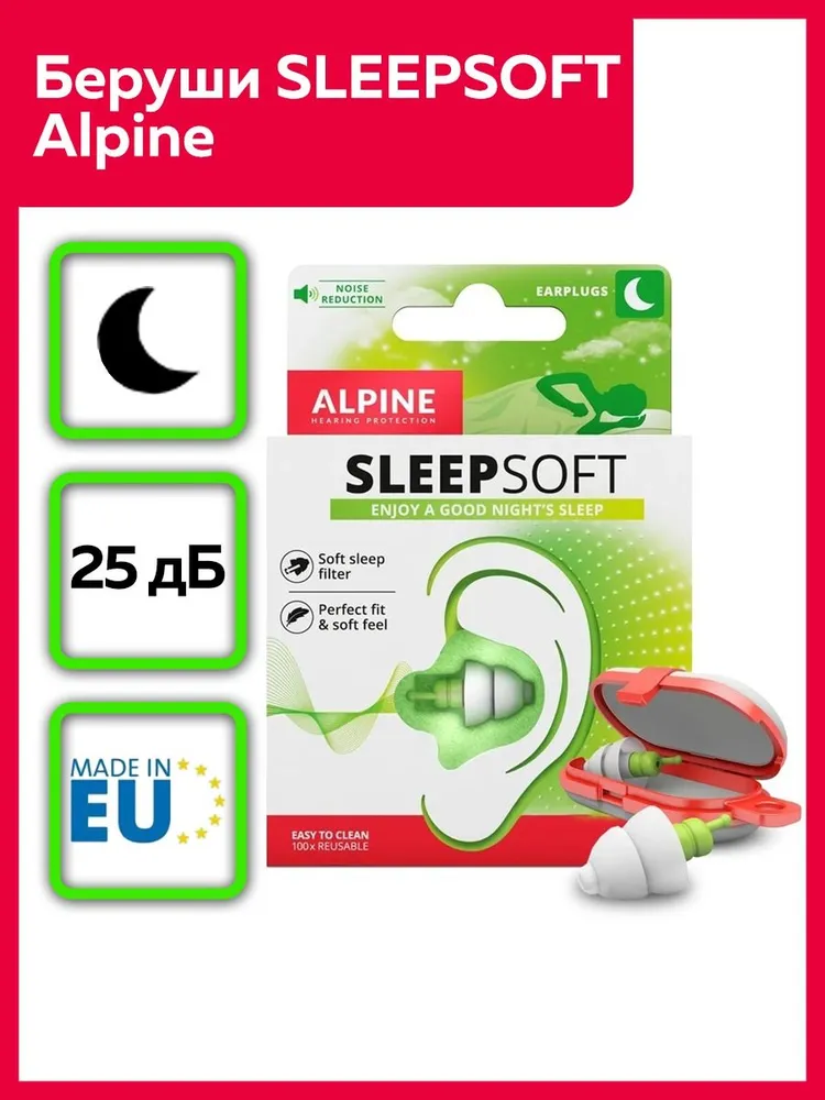 Специальный дизайн берушей SleepSoft обеспечивает очень удобную посадку за счет уникального материала AlpineThermoShape (инновация от Alpine). Этот материал принимает форму ушного прохода при нагревании материала до температуры человеческого тела, становясь практически неощутимым. С ними вам будет комфортно спать, даже повернув голову на бок, как вам удобно. Это гарантирует вам еще больший комфорт во время сна. ATS не содержит силикона и не вызывает аллергических реакций. AlpineAcousticFilters – специальные акустические фильтры блокирующие звуки храпа и окружающего шума, что позволяет большинству людей наслаждаться непрерывным сном. Многоразовые.