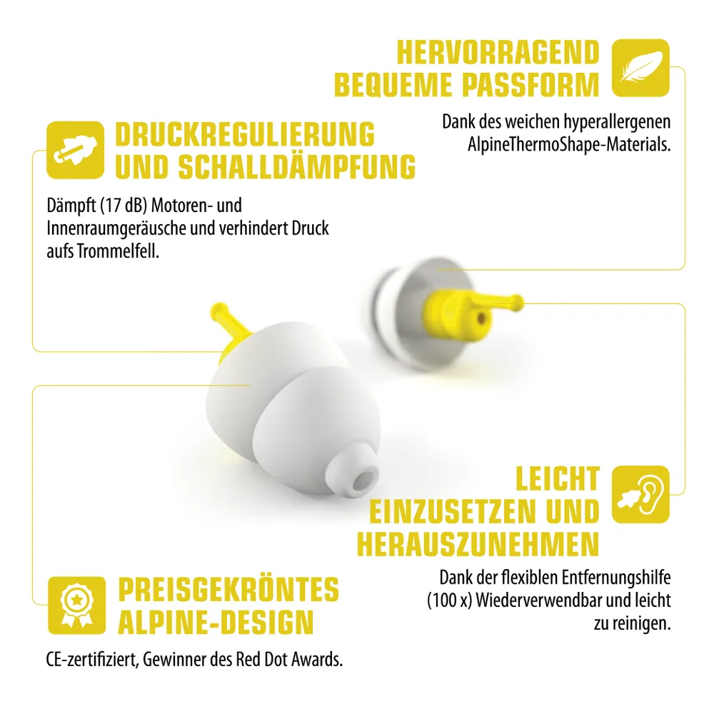 Беруши FlyFit очень удобно сидят в ушах. Они изготовлены из материала AlpineThermoShape, специально разработанного Alpine, который принимает форму слухового канала. Таким образом, они обеспечивают качественное шумопоглощение, при этом не создавая давления на ваши уши. Беруши из  материала AlpineThermoShape не вызывают ощущение изолированности от окружающего мира. Материал ATS гипоаллергенен и не содержит силикона. Таким образом, он не вызывает зуд и раздражение в ушах. Подавление внешнего шума на 17 дБ. Многоразовые.